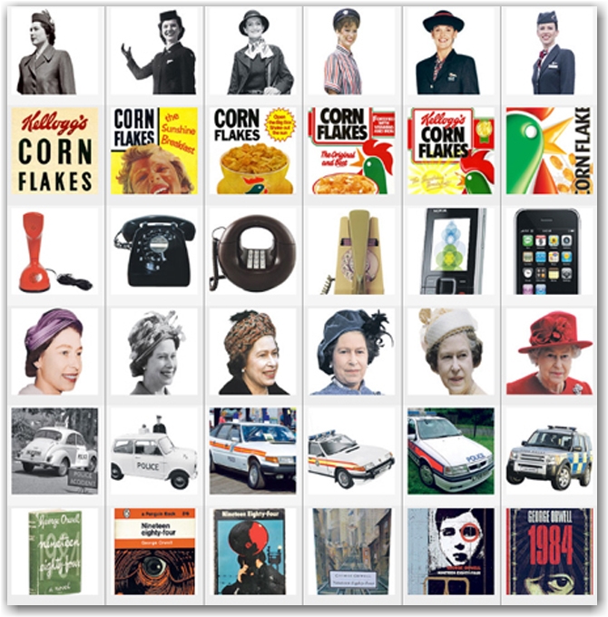 “The changing face of everyday design” 1950年代から現代までのデザインの変遷を並べてるんだろうけど、 これ見たときに何より思ったのは、「エリザベス女王ってすごいな!」ってこと。 周りのあらゆるものがこんなに移り変わってるのに、この人この間ずっと女王やってるんだよ。 電話の変わり様と女王の変わらなさ!
